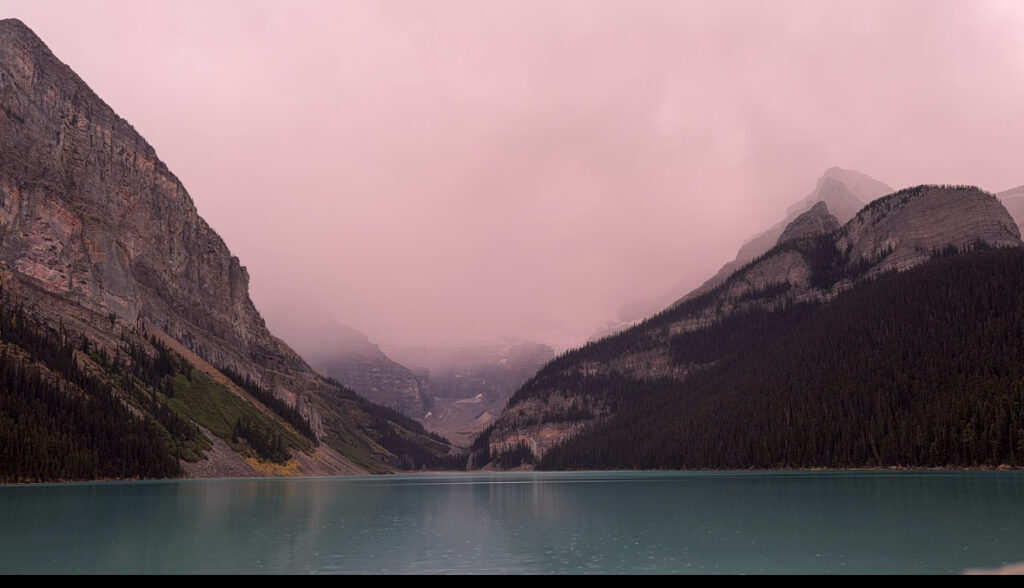 朝6:00バンフ発のRoamバスに乗ってレイクルイーズへ。9月下旬は日の出が遅く、7:30頃にようやく明るくなってきます。天気悪いですね。もやが赤くなって幻想的と言えなくもなかったですが、行く場所が岩場なので濡れていて欲しくない気持ちで